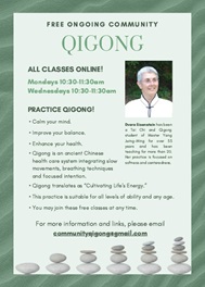 Mondays and Wednesdays 10:30 - 11:30am Free weekly online Community Qigong classes. All ages and levels of ability are welcome and you can join anytime. We are finding that with Zoom it is very easy to offer these classes to a larger group, so the more the merrier. To Join virtually: