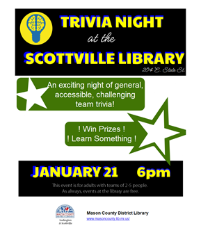 Scottville Library will again host an adult night of trivia on January 21, 2026, at 6:00 pm, by the one and only Richie! Woo-hoo! You are welcome to come with your own team of 2-5 people or individually join a welcoming team. We hope to see you there! All MCDL events are FREE.