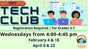 Tech Club: Spheros Grades 3-7 Select Wednesdays at 4 pm February 4 & 18 Explore technology and coding in this club for kids looking to get hands-on experience using different tech! February's session will involve the basics of using Spheros.