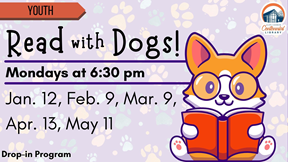 Read with Dogs 2nd Monday Once a Month at 6:30 pm February 9 Sit with licensed therapy dogs, and read a story of your choosing! You’ll have 15 minutes to read and pet a loveable dog! There will be two dogs. Drop In