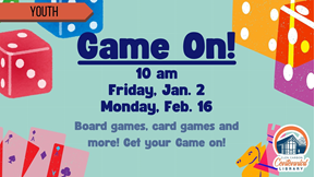 .  Monday, Feb. 16 at 10 am Board games, card games and more - get your game on at the library! Learn to play your Reading Dragon cards against your friends! Drop In
