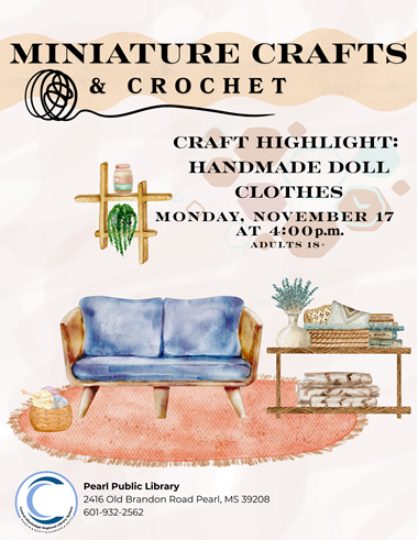 Miniature Crafts & Crochet Discover the joy of crafting in this hands-on class combining the art of miniatures and crochet! Whether you're a beginner or looking to brush up your skills, this free workshop is a great way to learn new techniques, meet fellow makers, and bring tiny creations to life—one stitch at a time.