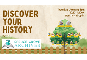 Discover Your History Thursday, Jan. 29, 10:30-11:30am Join the Spruce Grove Archives for a fascinating community workshop on what archives are, why they matter, and how they can help you preserve your own family history. Learn about the rich collections housed right inside the Spruce Grove Library—from photographs and maps to oral histories and local records—and explore how you can contribute to preserving your story. Ages 16+ Drop in