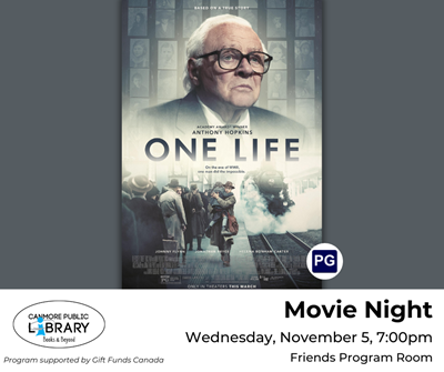 Every other Wednesday evening the Canmore Library shows a movie in the Friends of the Library Program Room starting at 7:00 PM.   Selections vary between classics and new releases. Admission is FREE, donations accepted. Bring a pillow, a bowl of popcorn, or even a friend! Make yourself at home and enjoy the cinematic experience.   November 5: One Life (2023)    Our Remembrance Day pick! The true story of Sir Nicholas 'Nicky' Winton, who, in the months leading up to World War II, rescued 669 predominantly Jewish children from the Nazis. Fifty years later, Nicky is haunted by the fate of the children he wasn't able to bring to safety – always blaming himself for not doing more. It's not until a live BBC television show introduces him to some surviving children - now adults - that he finally begins to come to terms with the guilt and grief he had carried for five decades.   Directed by James Hawes. Rated PG. Runtime: 1h 49m. Click here to view the IMDb listing. 2023 release.    When: Wednesday, November 5  |  7:00 PM Where: Friends Program Room, Canmore Public Library   November 19: A Complete Unknown (2024)   New York, 1961. Against the backdrop of a vibrant music scene and tumultuous cultural upheaval, an enigmatic 19-year-old from Minnesota arrives with his guitar and revolutionary talent, destined to change the course of American music. Timothée Chalamet stars and sings as Bob Dylan in the electric true story behind the rise of one of the most iconic singer-songwriters in history.   Directed by James Mangold. Rated PG. Runtime: 2h 15m. Click here to view the IMDb listing. 2024 release.    When: Wednesday, November 19  |  7:00 PM Where: Friends Program Room, Canmore Public Library