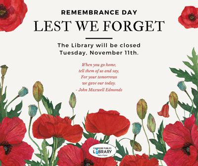 Please note that the Canmore Public Library will be closed on Tuesday, November 11 in honour of Remembrance Day.    We will resume regular operations on Wednesday, November 12 at 10:00am.    We would like to extend our deepest gratitude to all who have served, and continue to serve, Canada in times of war, conflict, and peace. We honour the courage and sacrifice of those who gave their lives for our freedom. We remember. Lest we forget.  "When you go home, tell them of us and say, For your tomorrows these gave their today."
