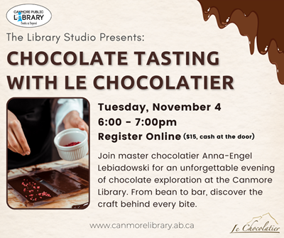 A sweet reminder for registered participants — our Chocolate Tasting with Le Chocolatier takes place Tuesday, November 4!    Join us for a delicious evening as chocolatier Anna-Engel Lebiadowski guides you through the fascinating journey of chocolate — from bean to bar — while you sample an array of exquisite flavours.   Please note: This event is full. If you’re registered but can no longer attend, we kindly ask that you cancel your registration so we can offer your spot to someone on the waitlist.   When: Tuesday, November 4 | 6:00 – 7:00 PM Where: Friends Program Room, Canmore Public Library Cost: $15 cash at the door to cover material costs.