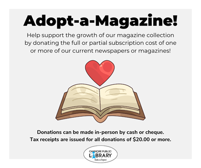 The Canmore Library has a number of magazines up for adoption!   We will be running our Adopt-a-Magazine program throughout the month of November.   Help support the growth of our magazine collection by donating the full or partial subscription cost of one or more of our current newspapers or magazines!   Donations can be made in-person by cash or cheque, and tax receipts are issued for all donations of $20.00 or more.   You can find a full list of titles currently up for adoption on our website, or visit the Library to view our full display.