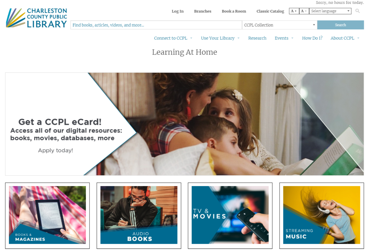 Don't have a CCPL library card but still want to access all our great digital resources? Charleston residents can now apply for a temporary digital library card. This card provides free access to most of CCPL's digital resources during the library closures. Applications must be made online and may require one to two days for processing. Applicants will not receive a physical card but will receive a card number that they can use to access the library's array of digital offerings. Sign up online at ccpl.org/ecard.