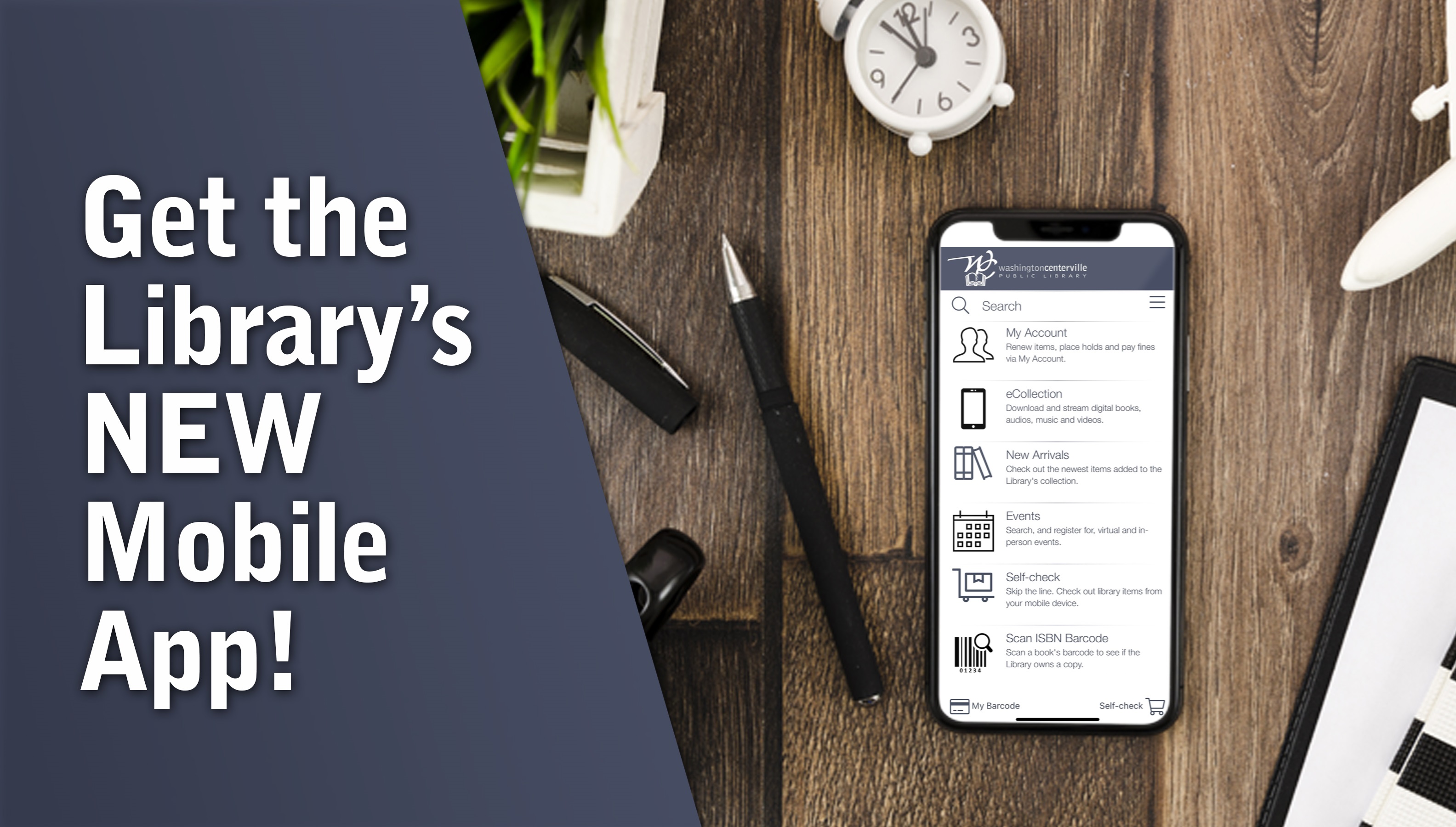 Mobile App - Use our new app to search the library catalog, view and manage account information, browse upcoming events and even check out physical library materials right from your phone! Download the app in the App Store or Google Play Store.