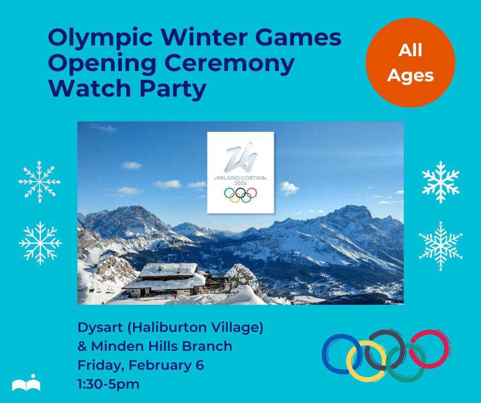 Olympic Winter Games Opening Ceremony Watch Party Get ready for the ultimate winter celebration! Join us for our Olympic Winter Games Opening Ceremony Watch Party and experience the excitement, music, and magic of the Games together. Minden Hills & Dysart branch: Friday, February 6, 1:30-5pm