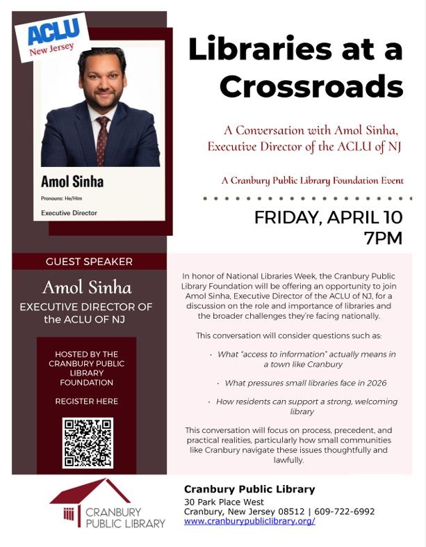 The Cranbury Public Library Foundation will be offering an opportunity to join Amol Sinha, Executive Director of the ACLU of NJ, for a discussion on the role and importance of libraries and the broader challenges they’re facing nationally.
