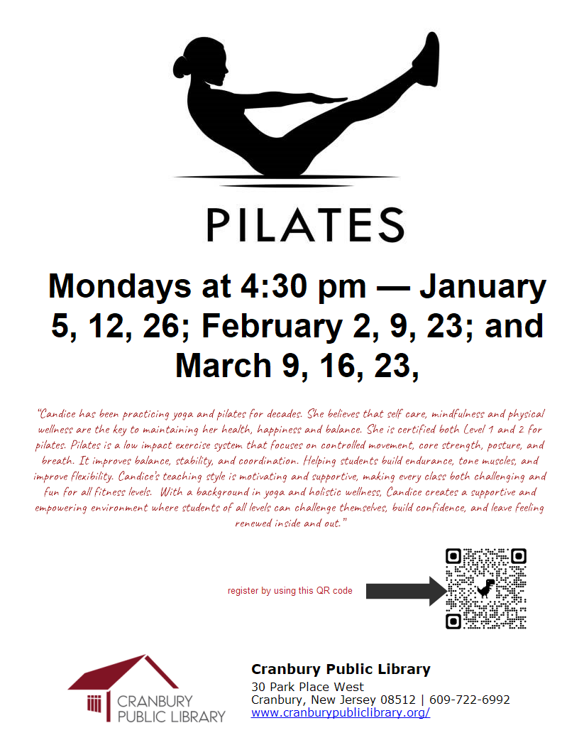 Mondays, January 5th, 12th, and 26th4:30 PM Candice Wisaksono is a certified Pilates instructor dedicated to guiding others toward deep relaxation, healing, and inner balance. With a passion for holistic wellness, she combines the restorative power of Pilates to help her students find peace, clarity, and renewal. Her classes offer a nurturing space to release stress, reconnect within, and restore harmony to the body, mind, and spirit. Please bring your own mat. Walk - ins are welcome.