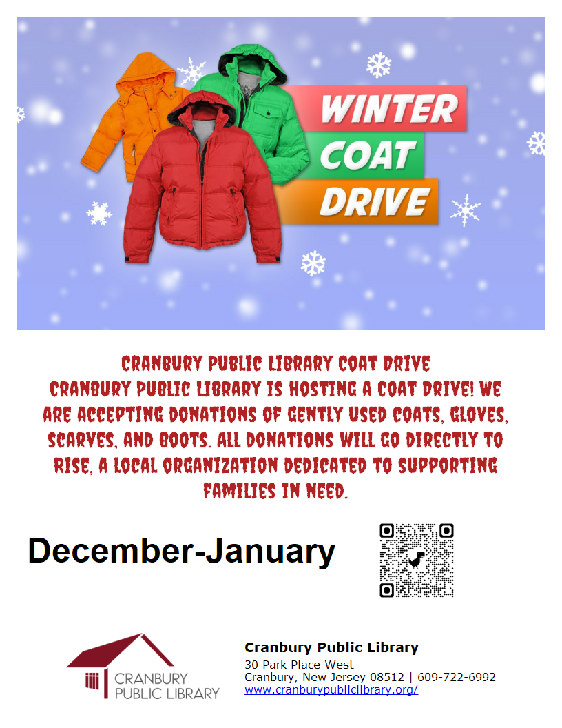 December - January Cranbury Public Library is hosting a Coat Drive! We are accepting donations of gently used coats, gloves, scarves, and boots. All donations will go directly to Rise, a local organization dedicated to supporting families in need. Please bring donated items to the circulation desk, and a staff member will assist you.