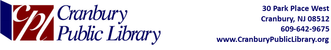 In the meantime we are available to answer your questions by email at reference@cranburypubliclibrary.org or phone. Note our phone number has changed to 609-642-9675. You may call or text this number. If you call, please leave a short message with your name and we will respond as soon as we can.
