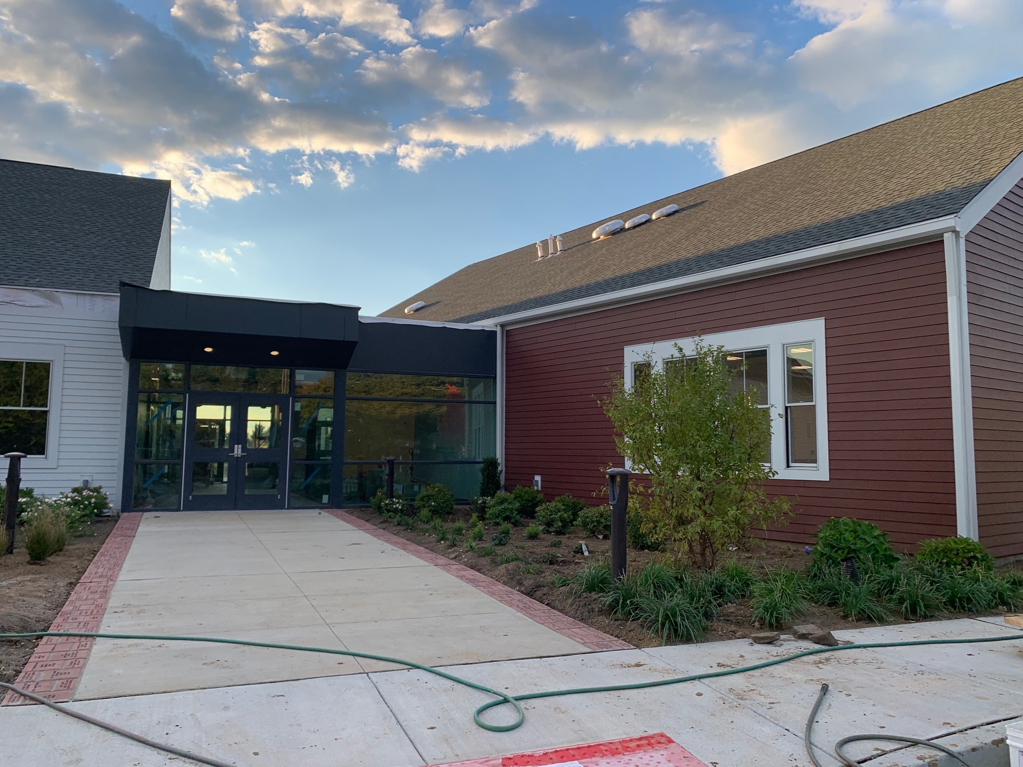 Entrance to the new library. Engraved bricks and landscaping line the walkway.