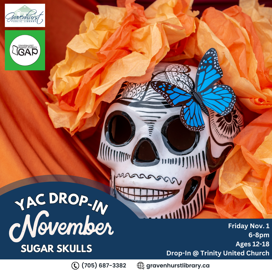 Join Miss Jen at G.A.P.'s Young Adult Centre (in the basement of Trinity United Church) on Friday Nov. 1st--the Day of the Dead--to make Sugar Skull Masks! The full YAC program runs from 6pm-8pm.
