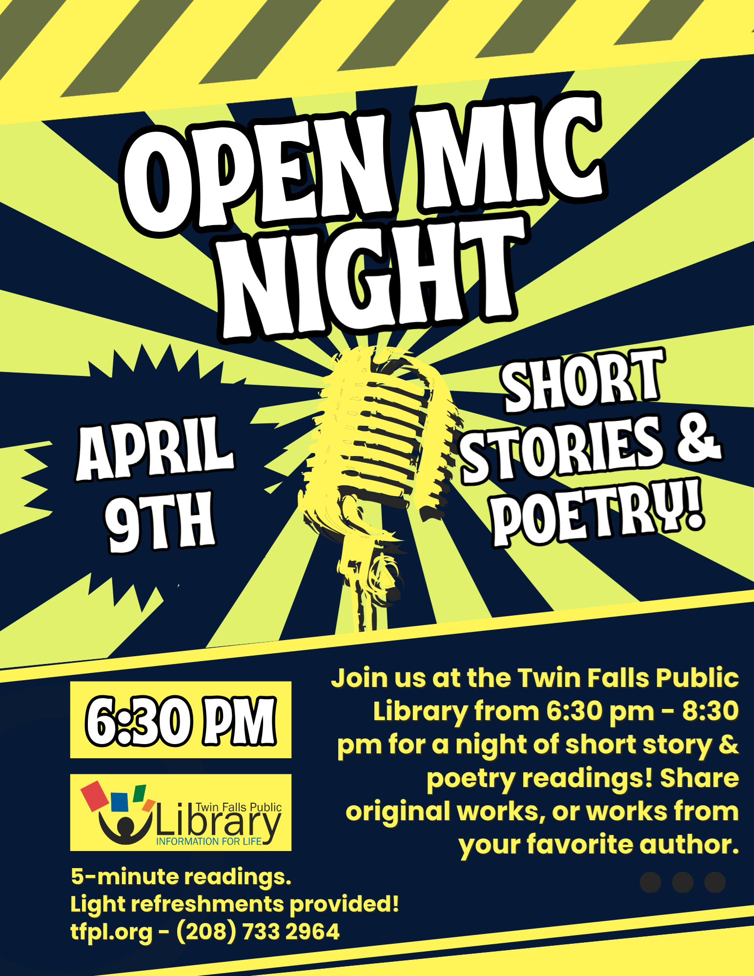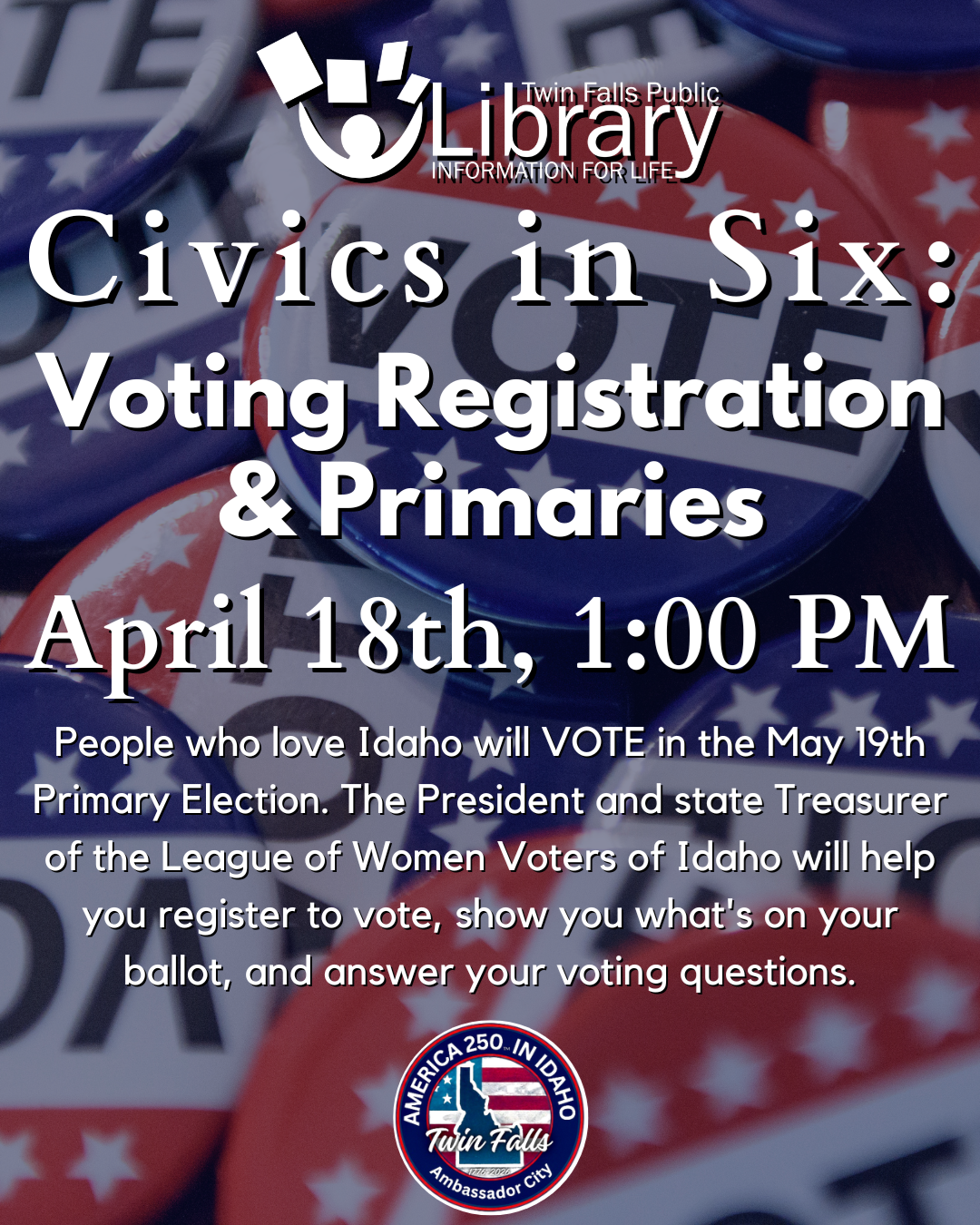 Visit the Twin Falls Public Library on April 9th at 6:30 PM for our monthly Open Mic Night! Come and enjoy a night of short stories & poetry. Participants are invited to share their own writings or some favorite pieces by other authors, or just come to listen! Sign-up is first come, first to read. 5 minute time limit per reading (multiple readings are allowed, depending on time). Check with a librarian for more information. We continue our Civics in Six programs with the League of Women Voters! Join us on April 18th at 1:00 PM to learn Why & How to Vote in the May Primary Election. People who love Idaho will VOTE in the May 19th Primary Election. The President and state Treasurer of the League of Women Voters of Idaho will help you register to vote, show you what's on your ballot, and answer your voting questions. Keep an eye out for more upcoming events with special guest speakers!