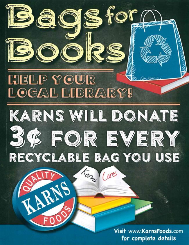 We are excited to partner with Karns Foods for the Bags to Books program! When shoppers use a reusuable shopping bag, Karns Foods will donate 3 cents to the Hershey Public Library. Donations will be distributed twice a year. A guaranteed minimum donation to the value of $500 per year; and a maximum of $1,500. This an ongoing program that has great benefits to the library and helps save the environment by reducing the amount of paper and plastic that finds its way into landfills. PLEASE TAKE ADVANTAGE OF THIS GREAT OFFER. Don't forget, Earth Day is on Sunday, April 22, 2018.