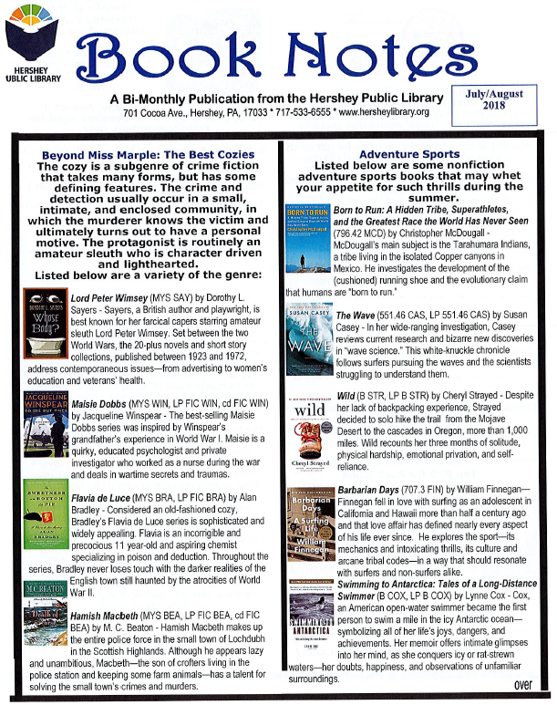 Thursday, August 16. 2:30 p.m. to 5:00 p.m. Stop by to meet staff from Children's services for stories at the Farmer's Market in Hershey. No registration required. The market is located next to the Cocoa Beanery at 1214 Research Blvd (off of Bullfrog Valley Road/US 322).