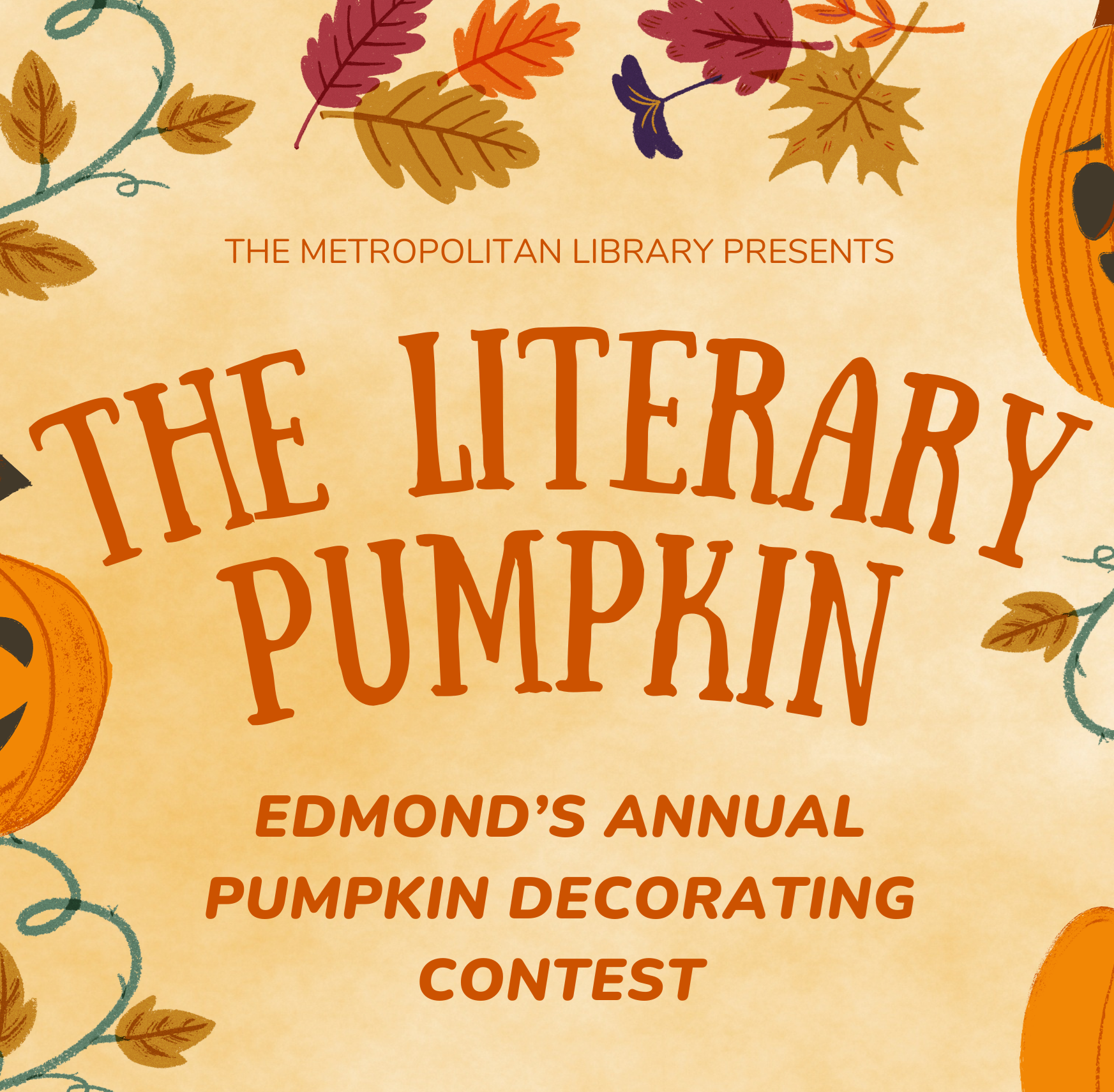 The Literary Pumpkin Entries Accepted October 6th - October 12th Edmond Library Come be a part of the Edmond Library's annual PUMPKIN DECORATING contest! You'll have two weeks to turn your pumpkin into an amazing work of art or humor based on your favorite literary characters, books or stories. Carve it, paint it, cover it with glitter or fabric or googley eyes and return it to the Edmond Library by close on Sunday, October 13th. The Literary Pumpkin is open to AGES 5+ this year - children, teens, and adults! Contact the Edmond Library for Submission Guidelines and entry form.