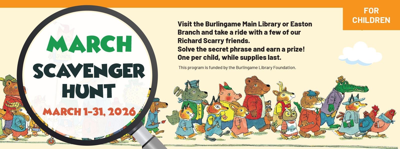 Visit the Burlingame Main Library or Easton Branch and take a ride with a few of our Richard Scarry friends. Solve the secret phrase and earn a prize.