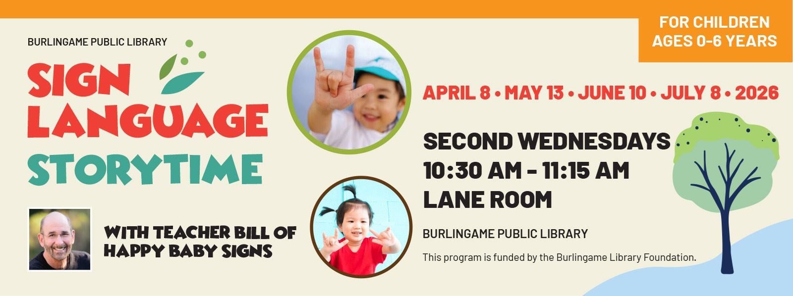 Join Teacher Bill from Happy Baby Signs for Sign Language Storytime! in the Lane Room at Burlingame Public Library. This is an excellent method to improve your communication with your infant or toddler. No registration required.