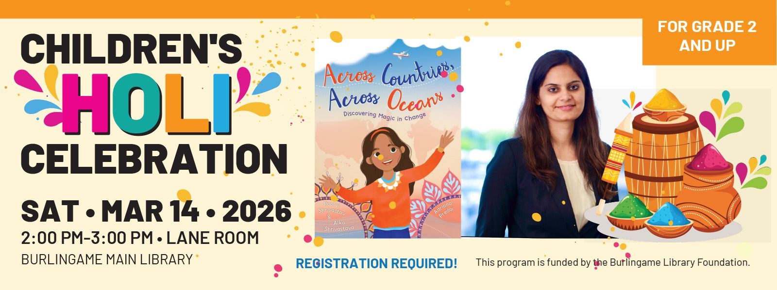 Join author Poorvi Shrivastav in a fun Holi program for children 2nd grade and up. Poorvi will read from her book "Across Countries, Across Oceans: Discovering Magic in Change." After the reading, enjoy a brief dance presentation and crafts.