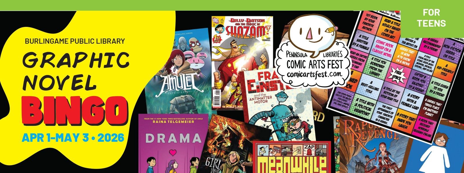 Celebrate Peninsula Libraries Comic Arts Fest with us by grabbing a bingo sheet and all the graphic novels you can!