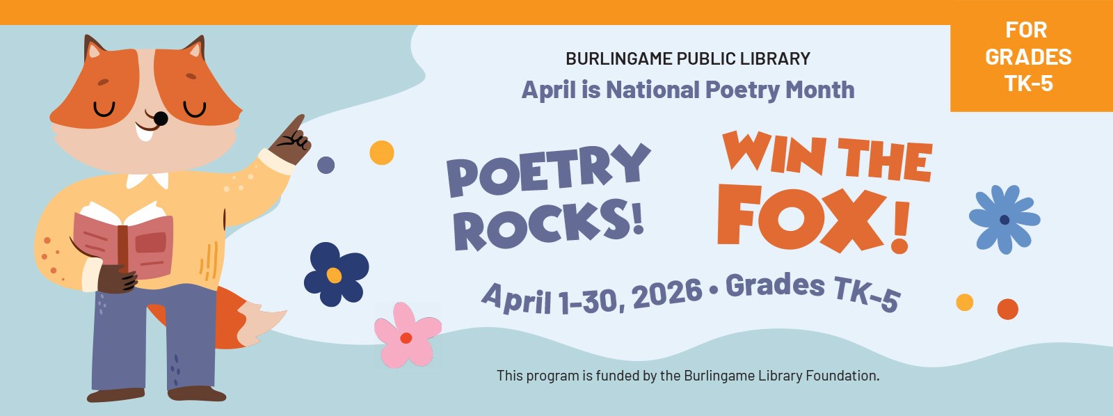 Elementary-age children are invited to write an original poem, bring it to the Main Burlingame Library or Easton Branch between April 1-30, 2026 and receive a free paperback book of poetry!