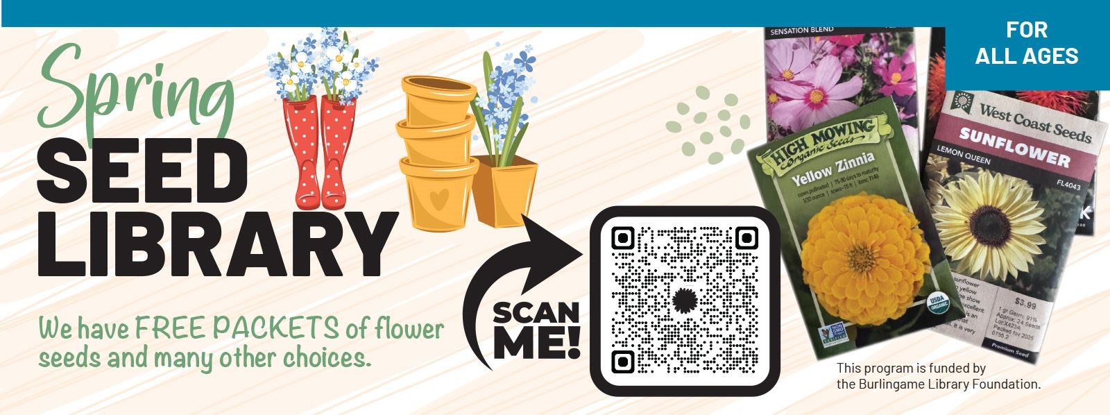 Spring is in the air, and we have your free packets of seeds ready for planting! The Burlingame Library is offering you four free packets of seeds for easy pickup at either the Main Library or our Easton Branch. There are currently more than 50 varieties to choose from, including California wildflowers, vegetables, and herbs. Just scan the QR code, fill out the form, and submit. Your order will be ready in three to five business days. You may order four packets every three months!