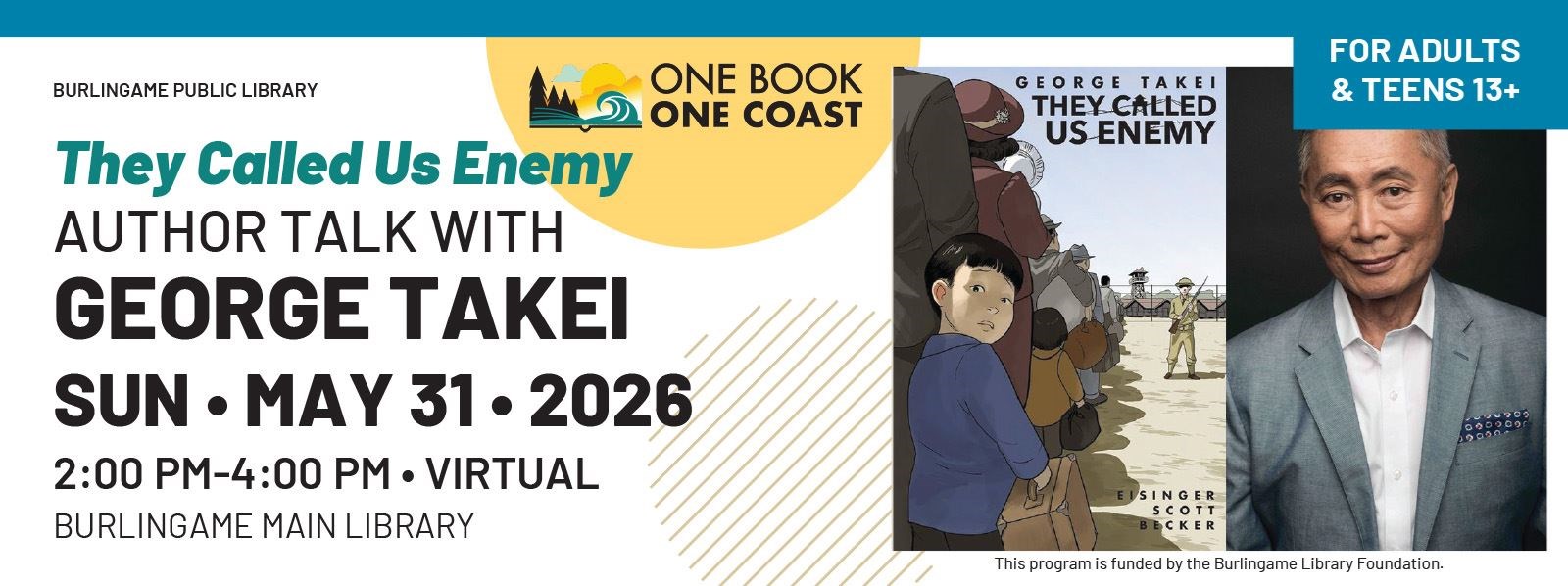 This Spring, the Burlingame Community reads They Called Us Enemy by George Takei, along with participating libraries in California, Oregon, and Washington. They Called Us Enemy is a #1 New York Times bestselling graphic memoir by actor, author, and activist George Takei. Through vivid art and gripping storytelling, Takei recounts his childhood experience of incarceration following Executive Order 9066 in 1942, along with over 120,000 people of Japanese descent.