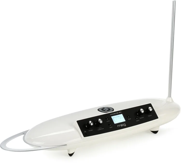 The Moog Theremini makes the unique Theremin instrument more accessible than ever before. A built-in tuner gives you visual feedback of your tuning accuracy, perfect for correcting your playing position. With 32 wavetable-based sound presets and different musical scales and root notes to choose from, the Theremini makes it easy to start playing. One of Sweetwater's favorite features is that you can control the amount of pitch quantization, giving you equal access to hard-tuned sounds and classic free-ranging Theremin sounds. CONTENTS: Theremini, Antenna (stored underneath device), Power Cord (2 pieces). Recommended for ages 18+. An adult MYLink library card is required to request and check out this item.