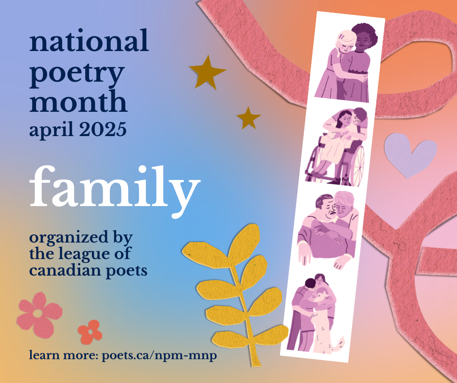 April is National Poetry Month Celebrate National Poetry Month 2025 using the theme FAMILY in its many forms: found and chosen family, birth family, and family that defies categorization. This April, turn to poetry to celebrate, cherish, mourn, critique, and explore the myriad bonds that family forms in our lives. Parents, pets, friendships, soulmates, siblings, plants, and beyond: the League invites you to examine the shape of family in your life now, to witness the intergenerational impact of ancestors, and to consider the role of family in generations to come. - League of Canadian Poets
