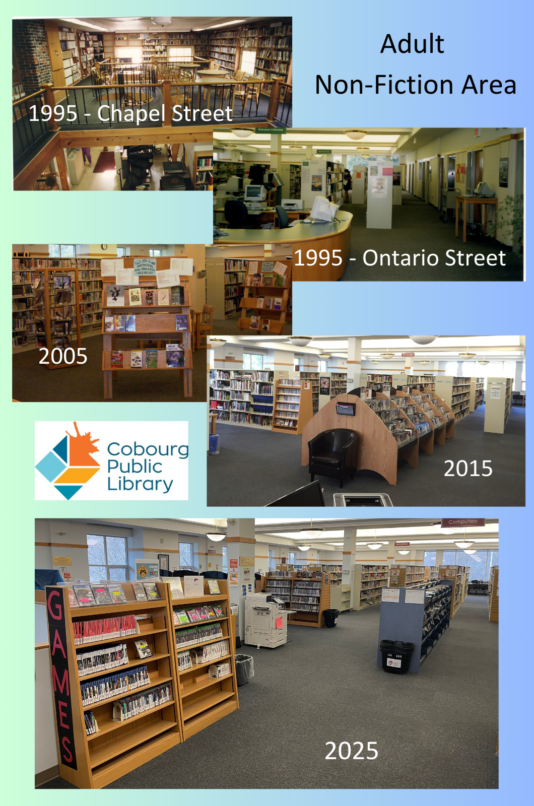 Celebrating 30 Years of the Cobourg Public Library on Ontario Street! This year marks our 30th anniversary of serving the citizens of Cobourg and Hamilton Township from our beautiful building on Ontario Street. We will be celebrating with an Open House on Sunday, September 28th 1:00 p.m. to 4:00 p.m. Each month, we will feature how our Library has changed and evolved over the last 30 years. This month, we are starting with the Adult Non-Fiction area on the 2nd floor. When the Library was still on Chapel Street, this collection was split between two rooms on the 1st floor with the remainder on the 2nd floor - accessible only by the spiral staircase. Our Ontario St. location in 1995 there was no public Internet, no Wi-Fi, no public computers. There was a photocopier, Reference Books and a Government Documents collection. The microfilm cabinets and readers were not in the Local History Room. There was a work table where the public computers are now.