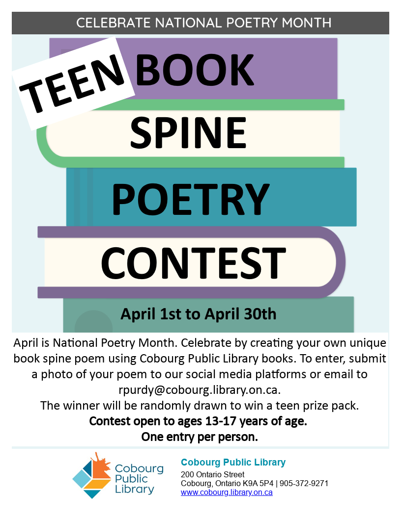 Teen Book Spine Poetry - All Locations Tuesday, April 1st to Wednesday, April 30th April is National Poetry Month. Celebrate by creating your own unique book spine poem using Cobourg Public Library books. To enter, submit a photo of your poem to our social media platforms or email to rpurdy@cobourg.library.on.ca. The winner will be randomly drawn to win a teen prize pack. Contest open to ages 13-17 years of age. One entry per person.