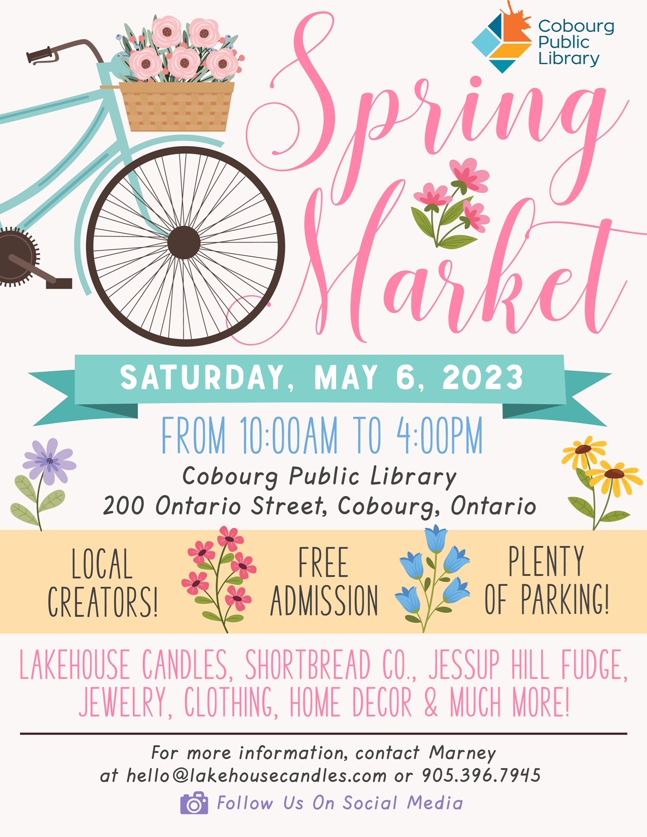 Spring Market - Cobourg Saturday, May 6th - 10:00 a.m. to 4:00 p.m. - Rotary Room Drop by to shop some amazing items from local creators: Lakehouse Candles, Shortbread Co., Jessup Hill Fudge, Jewelry, Clothing, Home Decor & much more - including a table of gently-used books to purchase by donation to support the Cobourg Public Library! For more information, contact Marney at: