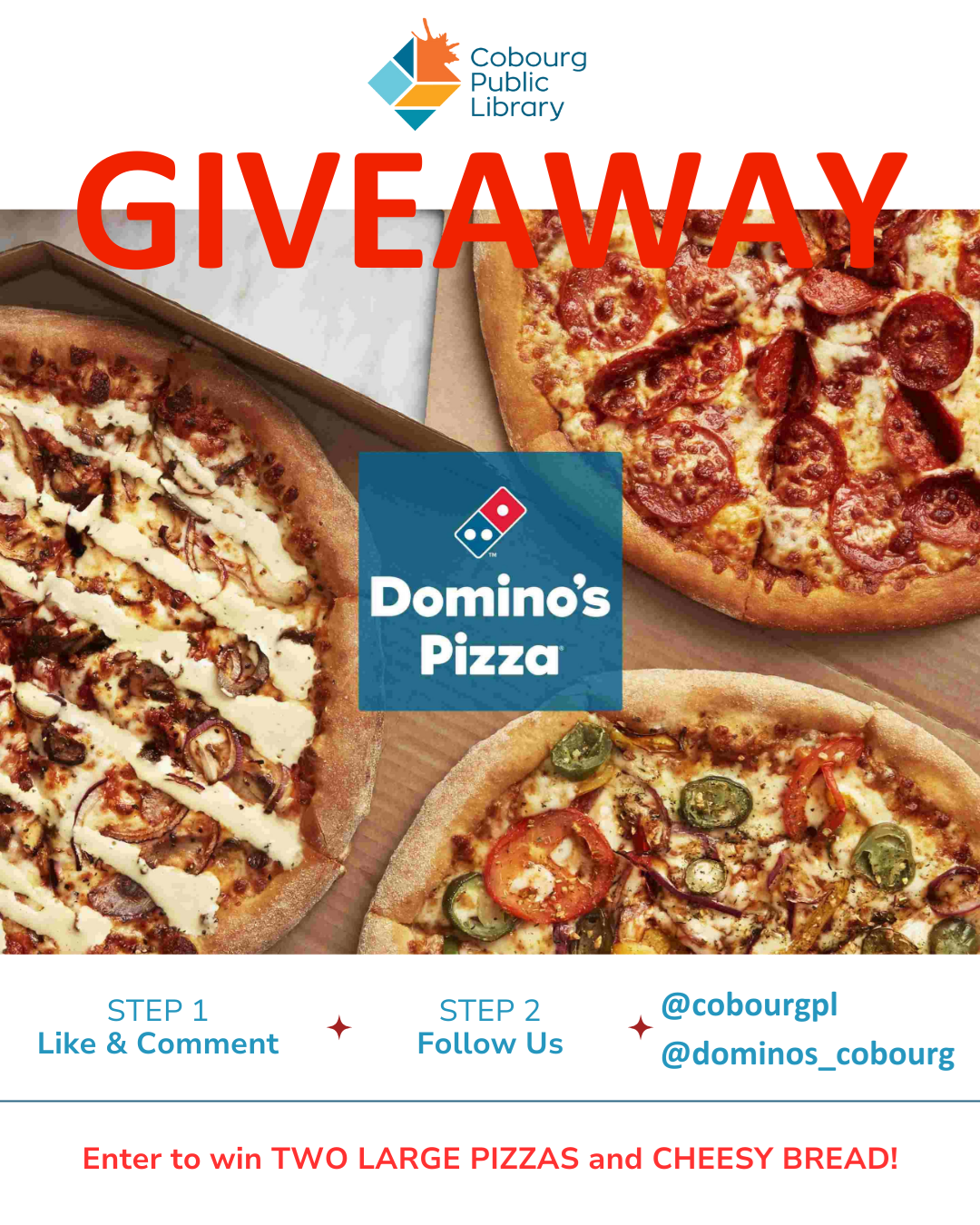 March Break Giveaway! Friday, March 7th to Friday, March 14thHead to Instagram or Facebook to let us know what your favourite library activity, event, or program is in the comments and you could win TWO (2) Large Pizzas and Cheesy Bread from Dominos Cobourg! All you have to do is: 1) Like and comment on the Giveaway post 2) Follow @CobourgPL and @Dominos_Cobourg This contest ends at 9:00 AM EST on Friday, March 14th.