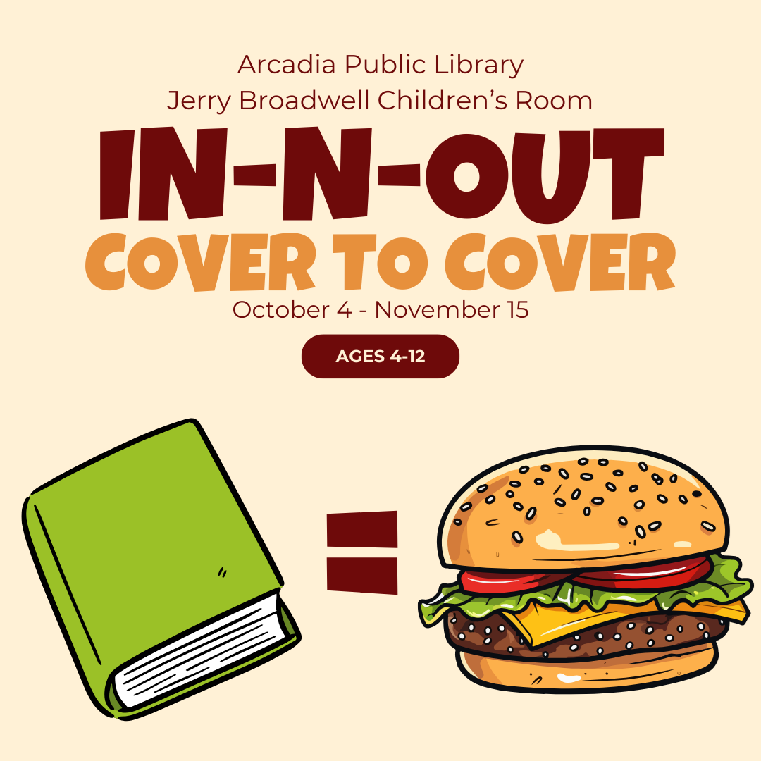 In-N-Out Cover to Cover Club For Ages 4-12. Register online for the program and read five books to earn a gift card redeemable for a free In-N-Out hamburger, cheeseburger, or cheese sandwich. Each child may earn up to three burger gift cards throughout the program. Online Registration begins Saturday, October 4, 2025. All reading must be logged and earned gift cards claimed by Saturday, November 15 at 5:30pm.