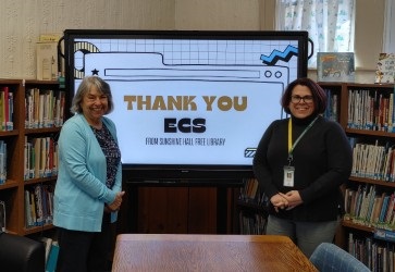 SUNSHINE HALL GIVES THANKS! Librarians have been coping with increased stress for some time - - from a variety of sources... Here's some news that reinforces our belief in how much libraries are valued and respected ----------------------------- Blessed by the Goodwill of our Community Sunshine Hall Free Library in Eldred NY serves the towns of Highland and Lumberland. We are thankful to have support from so many people in our community in so many ways. Recently two events have emphasized how lucky we are. We reached out to the Director of Technology at Eldred Central School for advice on what type of equipment to purchase for videoconferencing. This resulted in the donation of a 65” Smart Screen that was no longer in use at the school. Traci Ferreira, the District Superintendent visited the library to see the equipment in place. courtesy of Patty Kennedy, Library Director