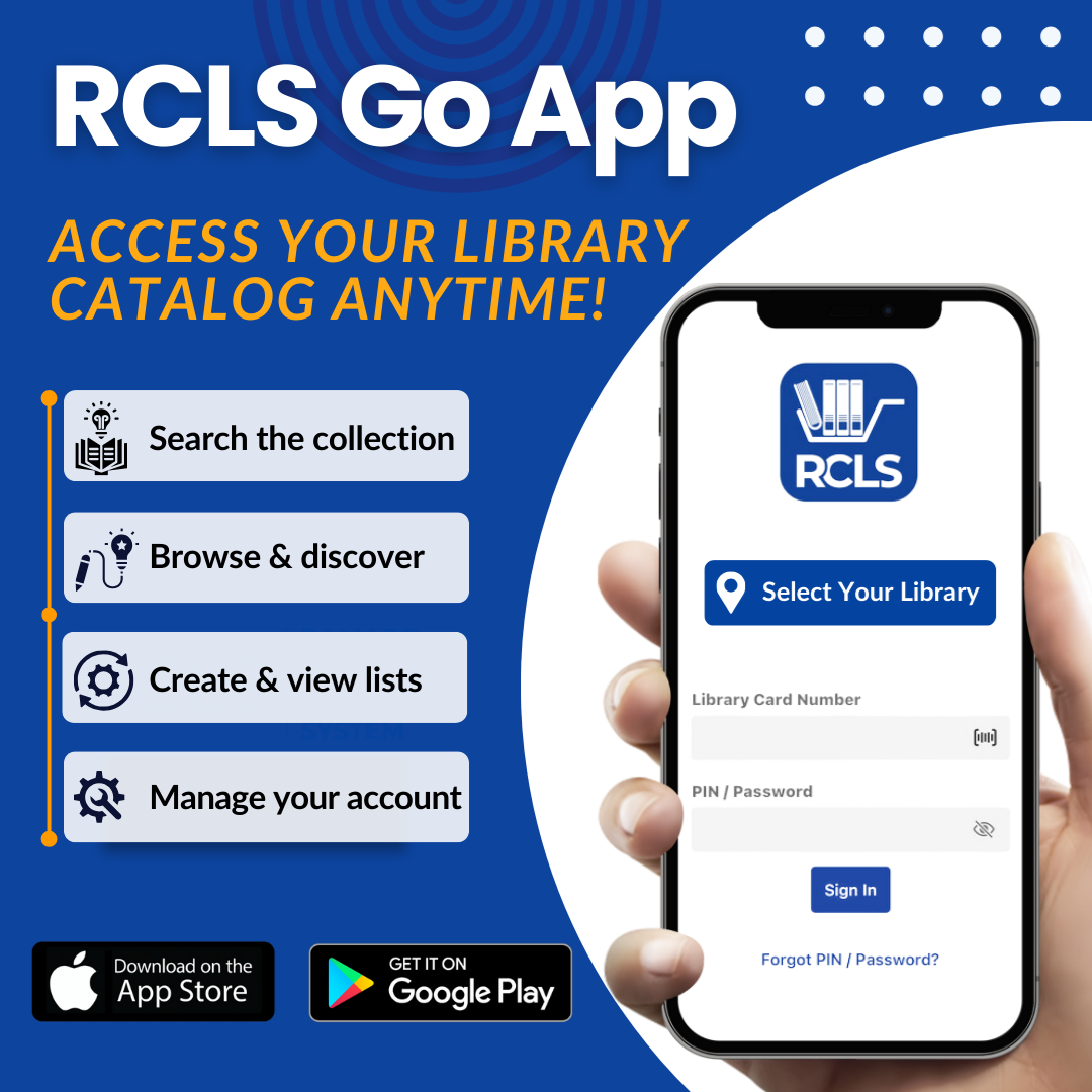 Download the RCLS Go App! Search the catalog, manage your account, and explore your library anytime, anywhere. Available on both the App Store and Google Play!