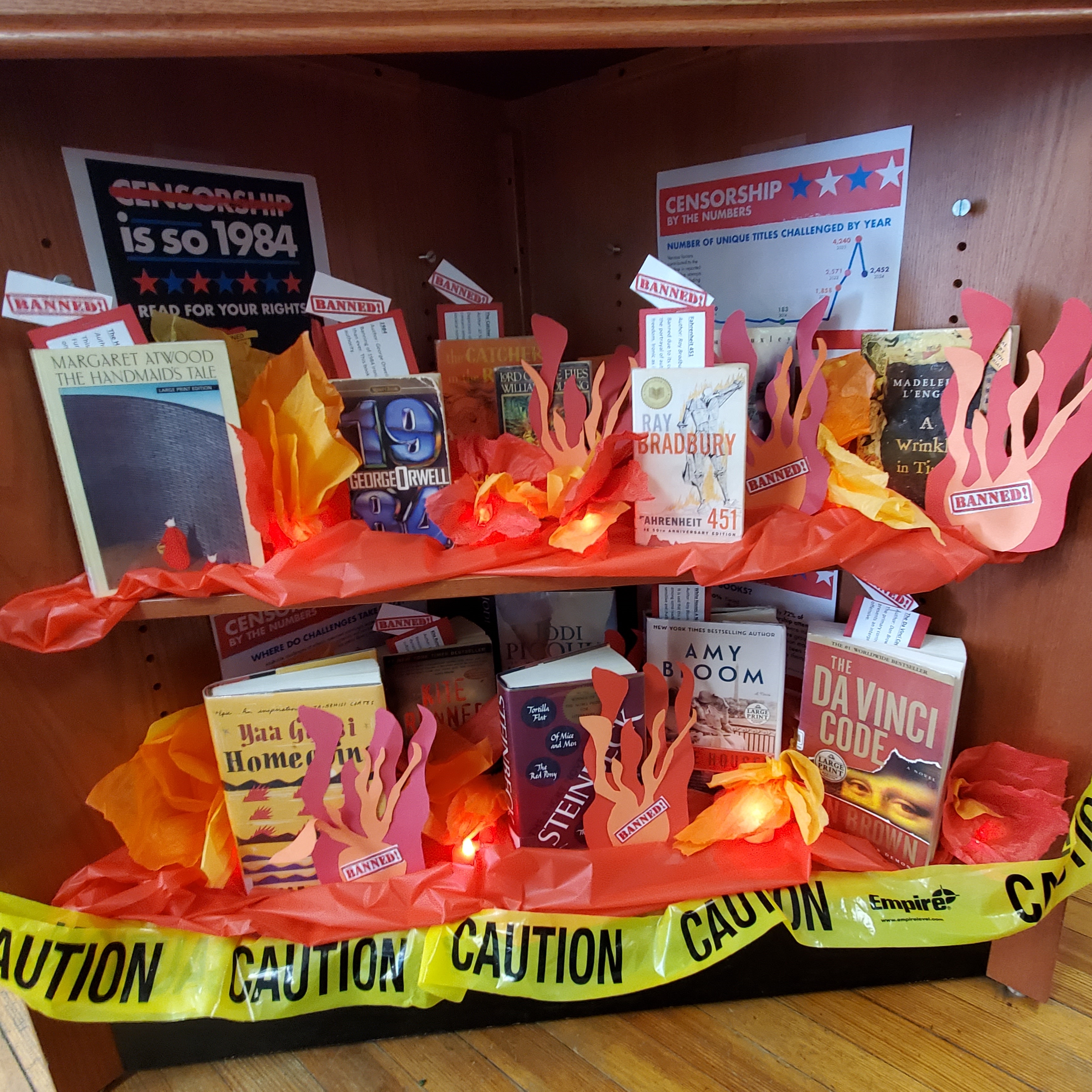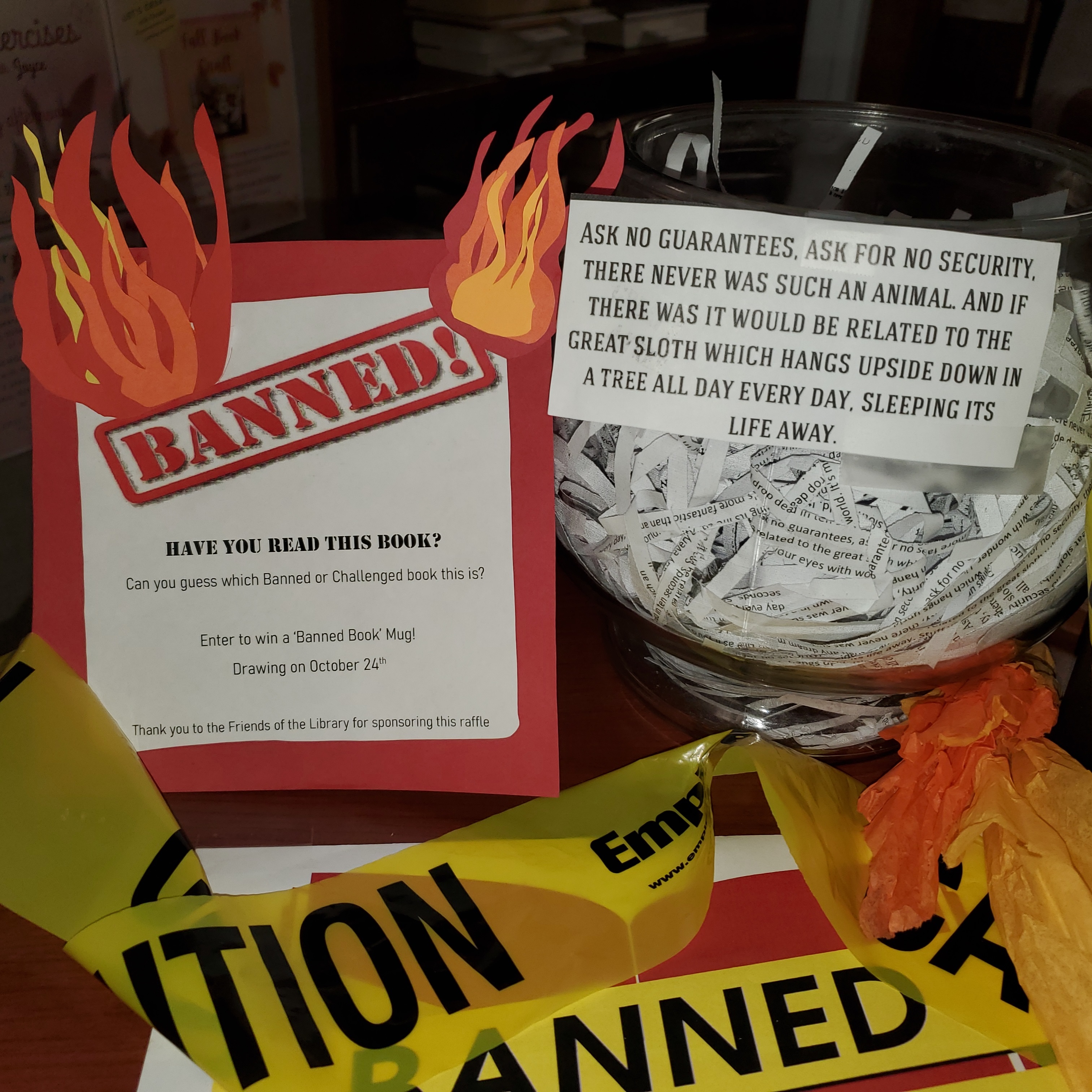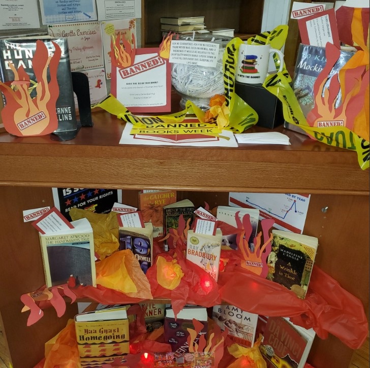 BANNED BOOK display is Sizzlin' HOT!!! Bringing the "emergency" front and center for visitors to the Pine Bush Area Library, new staffer Nicole Comerford created a striking display and activities to engage patrons! They are raffling off an I'M WITH THE BANNED mug as a prize to anyone who guesses which banned book a phrase comes from... Additionally, each book in the display has a bookmark telling why it was banned. Images courtesy of Vicki Ducham, PBL