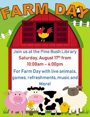PINE BUSH LIBRARY TO HOST FARM DAY August 17th ~ 10am-4pm Once a year the Library holds Farm Day to allow parents and children to actually touch, smell, and be around some farm animals. They may see them from a distance, but never have the opportunity to interact with them. It truly is a fun and educational day, as the farmers and individuals bringing their pets and harvests are wonderful educators answering any and all questions! Because it attracts so many people, some of whom are new to our area, many service organizations will be part of the event to make the newer families (and even older families!) aware of what is available out there to assist them with their lives.