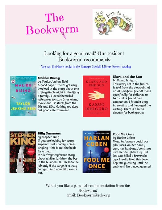 The Bookwerm Please be sure to check in with our local resident Bookwerm Eileen Acosta for book recommendations! A few of her recent favorites are: Taylor Jenkins Reid Kazuo Ishiguro Stephen King by Harlan Coben For more book recommendations email: Bookwerm@rcls.org