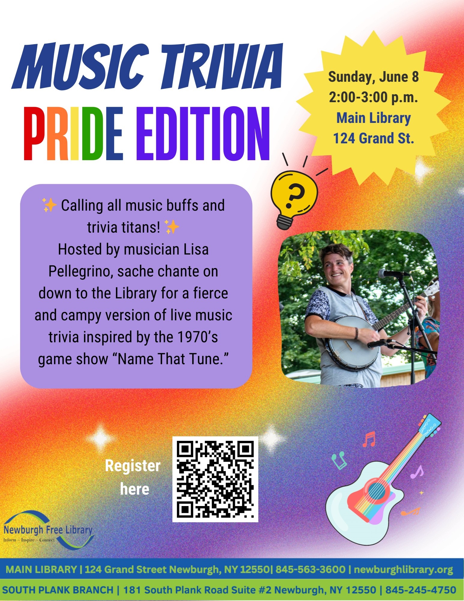 Music Trivia: Pride EditionSunday, June 8th ~ 2-3pm Newburgh Free Library - Main Library, 124 Grand St ✨ Calling all music buffs and trivia titans! ✨ Bring your crew for Music Trivia - Pride Edition! Be ready to sing your favorite pop tunes, TV theme songs and R&B hits from the top of your lungs. Be there or b flat 🎤 Register here.