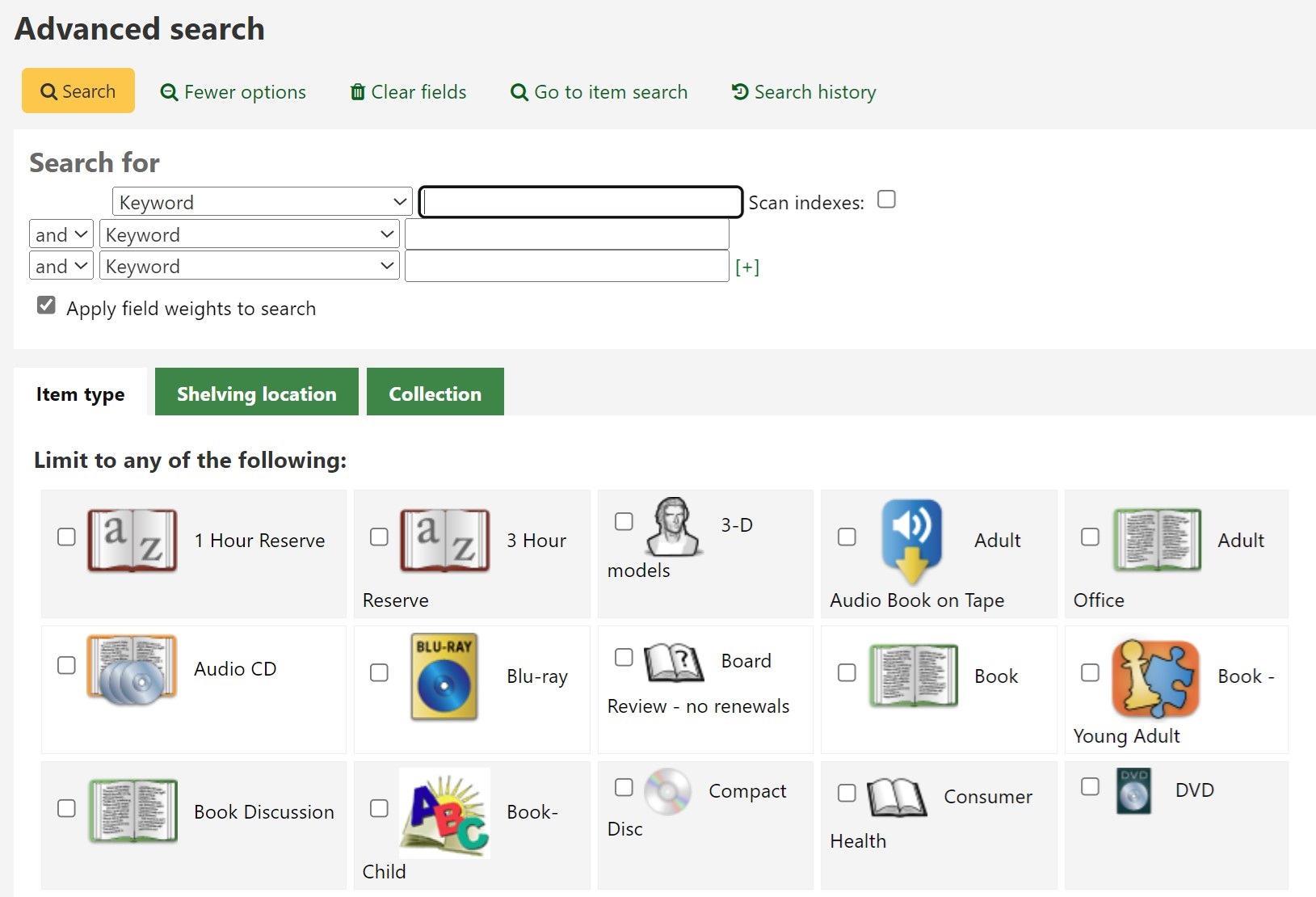 KOHA ILS: FEATURE HIGHLIGHT Koha offers a more intuitive and robust Advanced Item Search than Symphony provided. You can limit your search by Item Type, Shelving Location, or Collection in addition to your search query within any available search index. And did we mention support for Boolean operators?