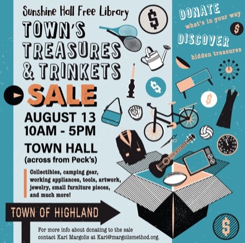 Sunshine Hall Free Library Town's Treasures and Trinkets Sale Saturday, August 13, 2022 10:00 am to 5:00 pm A fun way to support the library's community programs! Loads of items - all in excellent condition at reasonable prices. Free family activities on the library's beautiful deck. Face painting, puppetry, games, refreshments and giveaways... The amazing River Ramblers band will be performing at the Shrewd Fox Brewery (just behind the library) from 5pm to 8pm. The band is donating their time and the brewery is donating all proceeds! All funds raised go directly toward supporting existing and new community programs. Mark your calendars, and don't miss this great event!