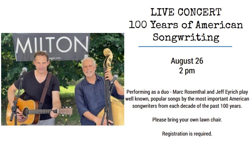 SWEET SOUNDS ON THE PATIO AT GOSHEN LIBRARY Featured songwriters include Irving Berlin, Fats Waller, Johnny Mercer & Harold Arlen, Rodgers & Hart, Oscar Hammerstein, Felice & Boudreaux Bryant, Bob Dylan, Bert Berns, Carole King & Gerry Goffin, Sam Cooke, Burt Bacharach & Hal David, Bruce Springsteen, Neil Young, Beck and more! |