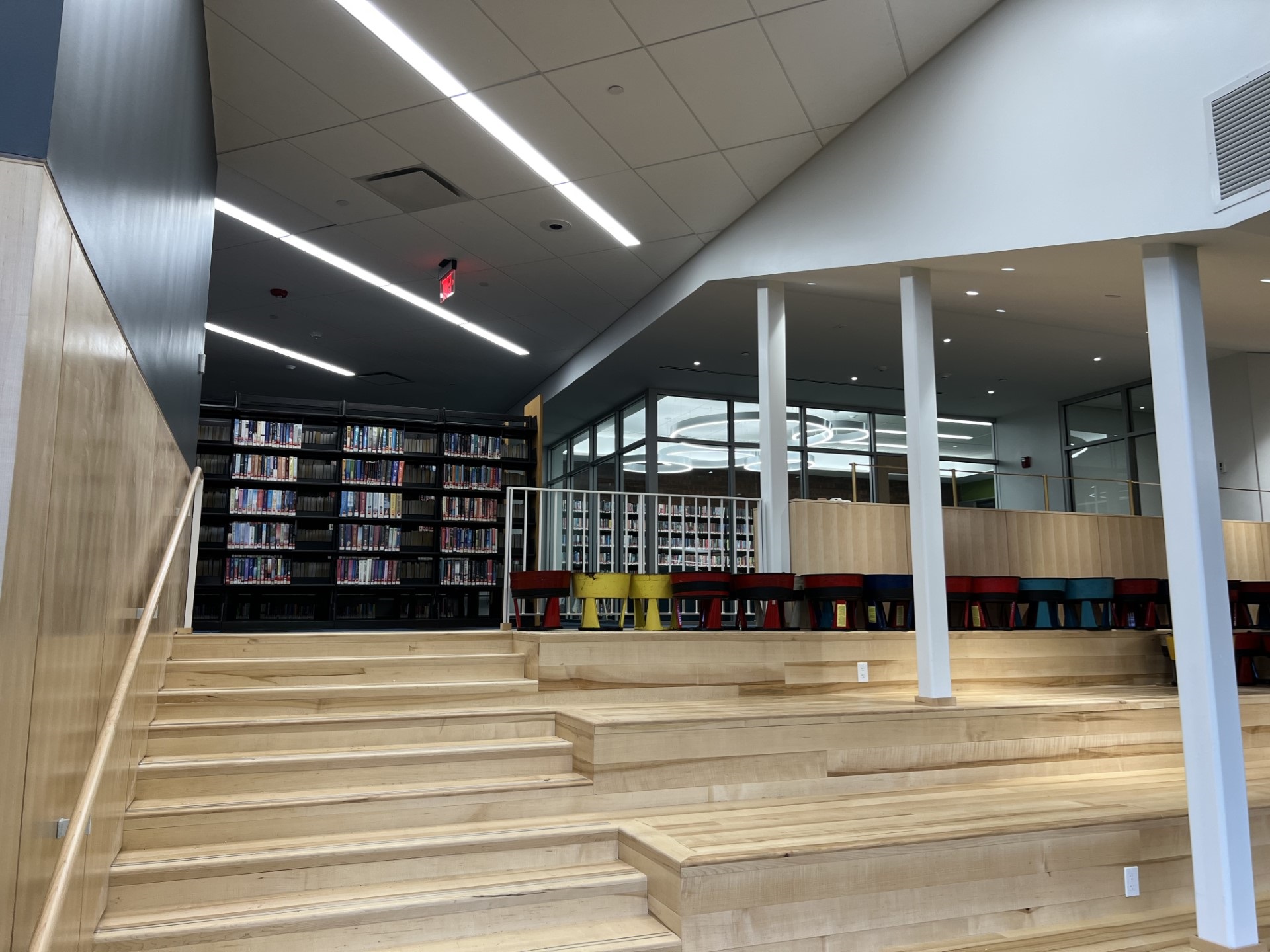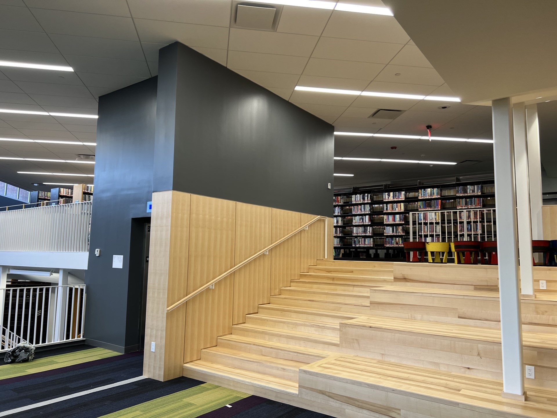 Almost home again! The wait is nearly over! Staff are moving back in, and the books have been returned to the shelves. New City Library can't wait to welcome back patrons to their renovated building. The refreshed spaces include brand new large meeting rooms as well as smaller group study spaces, along with carrels and perch seating for those working on their own. There are new outdoor spaces too with seating in front and in the back of the building. New carpets, walls, ceilings and lighting fixtures, reconfigured steps and the addition of forum seating in the main area -- it's nearly unrecognizable from its former state. The staff are raring to open the doors soon and hope to see you there!