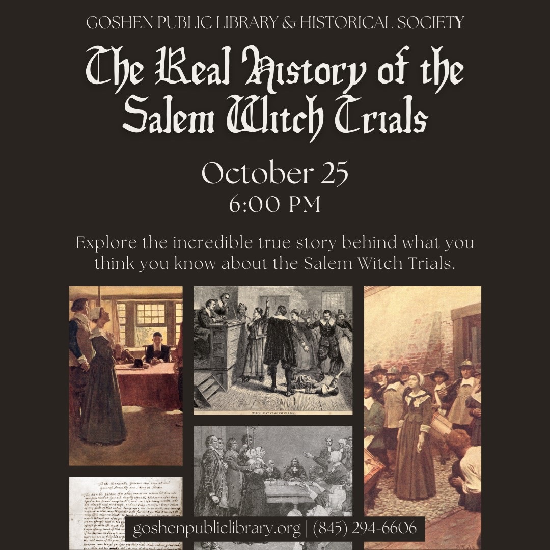 Enjoy a bewitching evening in Goshen... An in-depth look at events occurring before, during and after one of the darkest chapters in American history ...the Salem Witchcraft Trials!