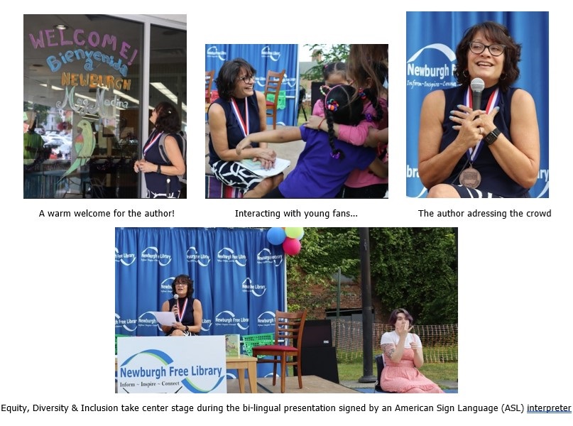 The early evening event on the Library Plaza featured activities, music, and an enthralling talk by Ms. Medina. The author posed for photos with attendees and